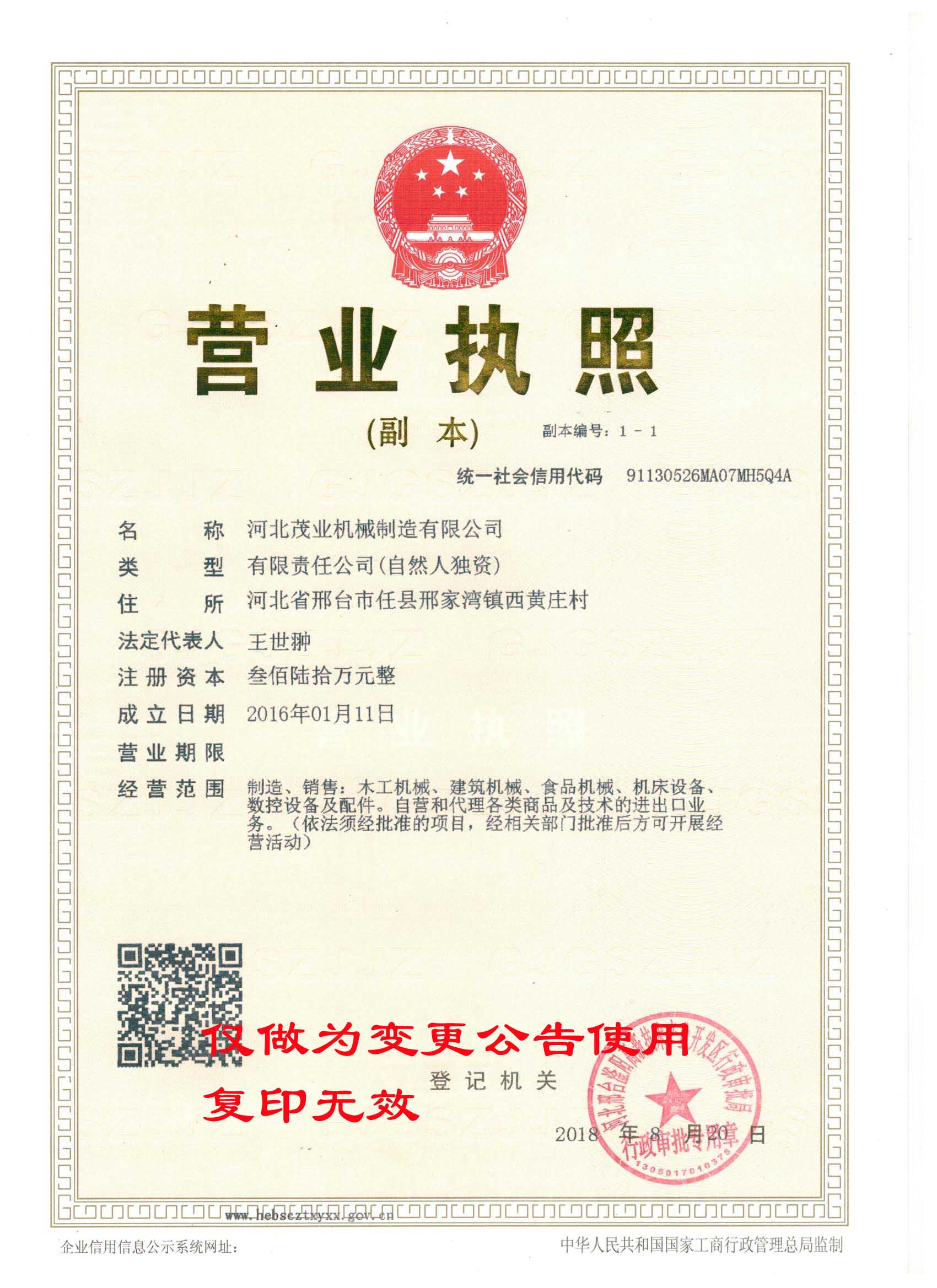 我司邢臺茂業(yè)機械制造有限公司,因公司業(yè)務發(fā)展的需要,現(xiàn)已整體變更為河北茂業(yè)機械制造有限公司,并于2018年8月20日取得河北邢臺滏陽高新技術產業(yè)開發(fā)區(qū)審批局頒發(fā)的營業(yè)執(zhí)照?,F(xiàn)將有關事項公告如下: